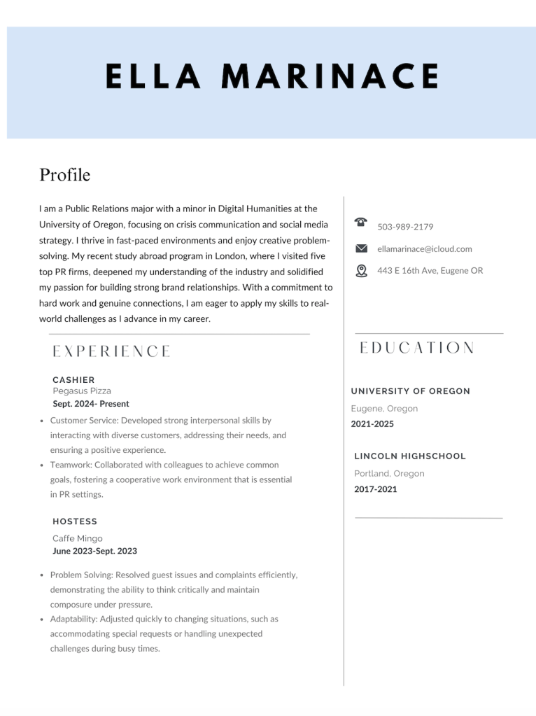 Throughout my college years, I’ve worn many hats in customer service and the food industry. One of my most memorable experiences was working as a host at a high-end, fast-paced restaurant. This role strengthended my natural talents in organization, attention to detail, and teamwork—skills I’m eager to apply in my future PR career.